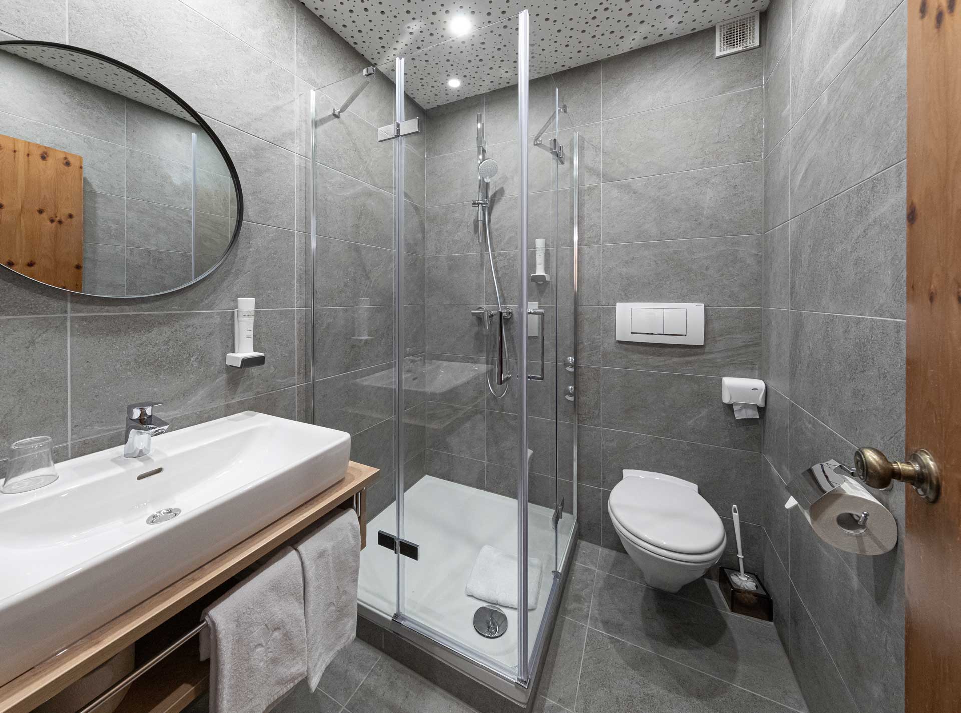 Our Suite Liesl is great for families who wish to spend time together, but once in a while need to retreat in private. Two separate bedrooms with boxspring beds, three full bathrooms with shower, three flat screen smart TV’s, a Nespresso coffee maker and three private terraces and a centrally located living and dining area with kitchenette and pull-out sofa. Generous space, real wood floors and a cozy seating area make feeling comfortable easy.